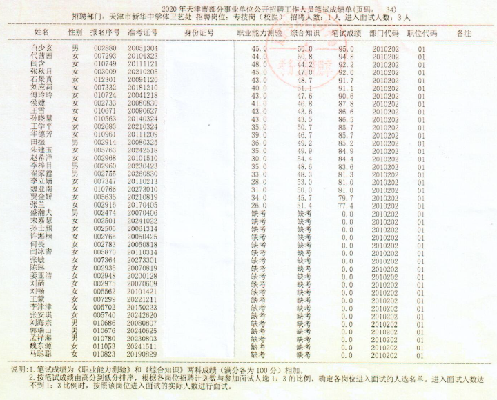 天津市新华中学2020年公开招聘校医笔试成绩公示