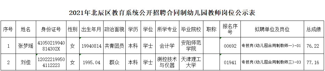 2021年天津市北辰区教育系统公开招聘合同制幼儿园教师拟聘用人员公示(第三批)