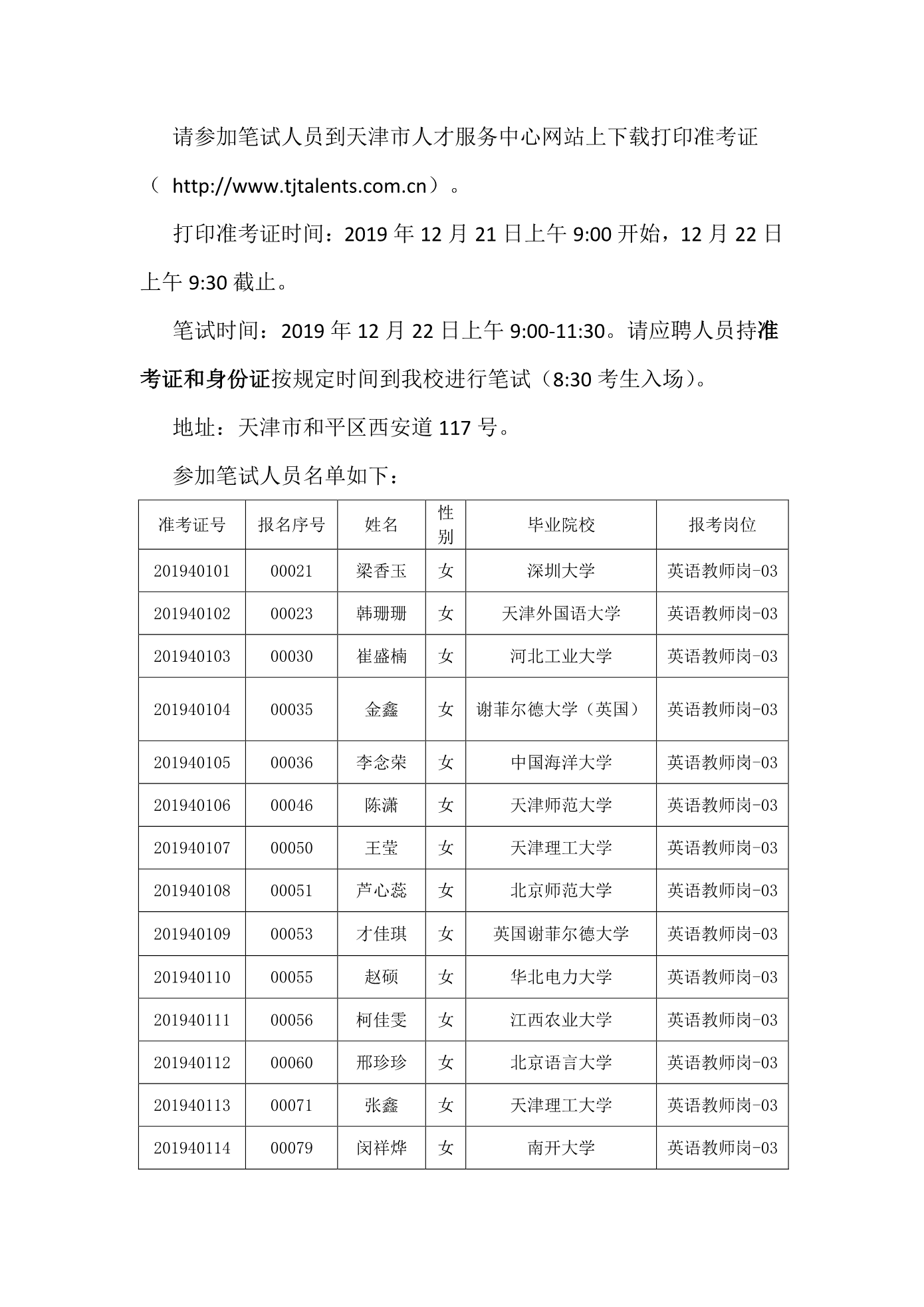 天津市第一中学2020年公开招聘参加笔试人员名单