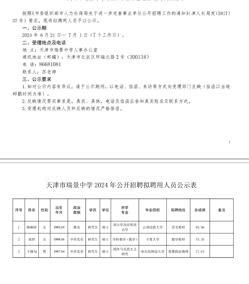 天津市瑞景中学2024年公开招聘拟聘用人员公示