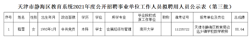 天津市静海区教育系统2021年度公开招聘事业单位工作人员拟聘用人员公示(第三批)