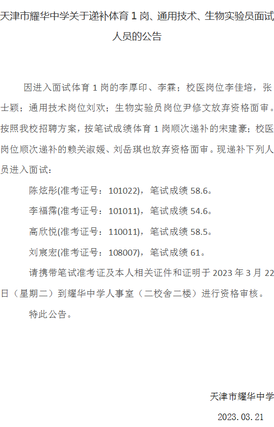 天津市耀华中学递补面试人员公告
