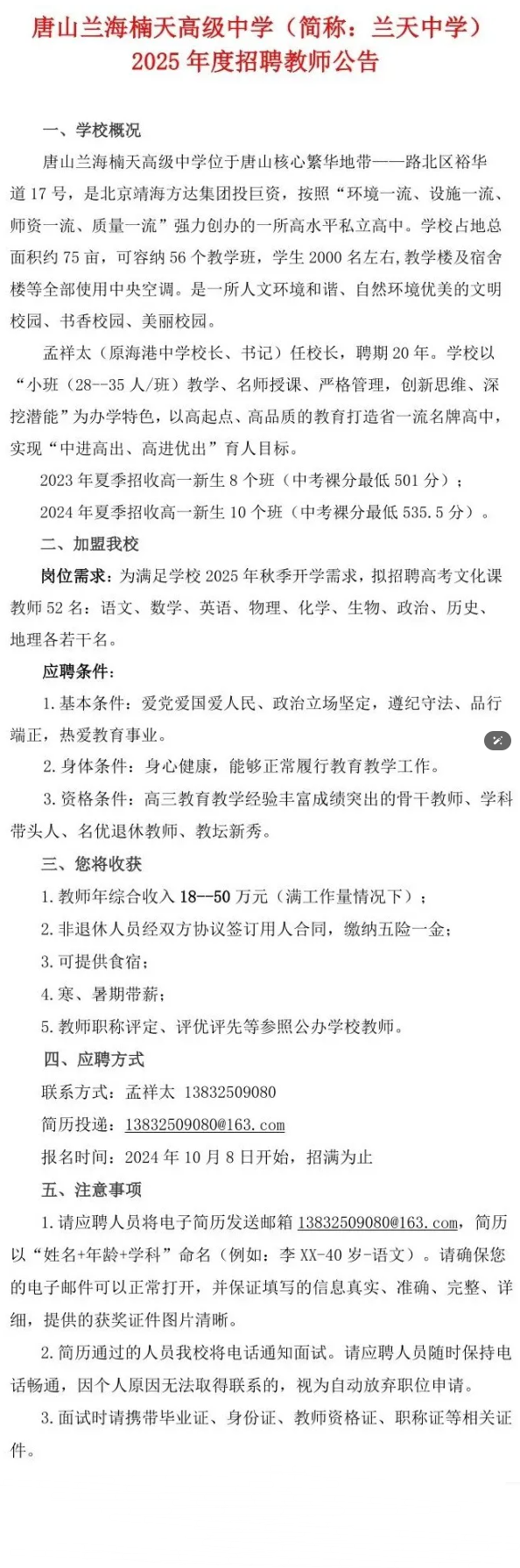 唐山兰海楠天高级中学2025年高薪招聘52名教师公告