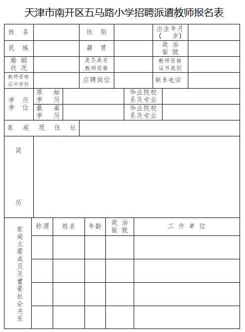本次报名,请报考人员将填写的报名表(见附件1)发送至天津市南开区五马路小学邮箱wumarenshi@163.com,招聘单位以邮件回复方式与报考人员进行确认。每位报考人员只能报考一个岗位(学科)。