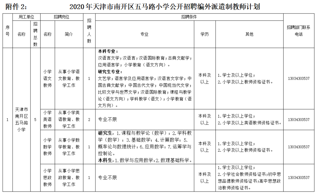 各岗位具体报考条件详见附件2《2020年天津市南开区五马路小学公开招聘编外派遣制教师计划》。