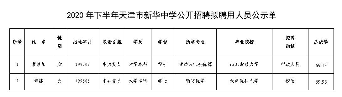 2020年下半年天津市新华中学公开招聘拟聘用人员公示