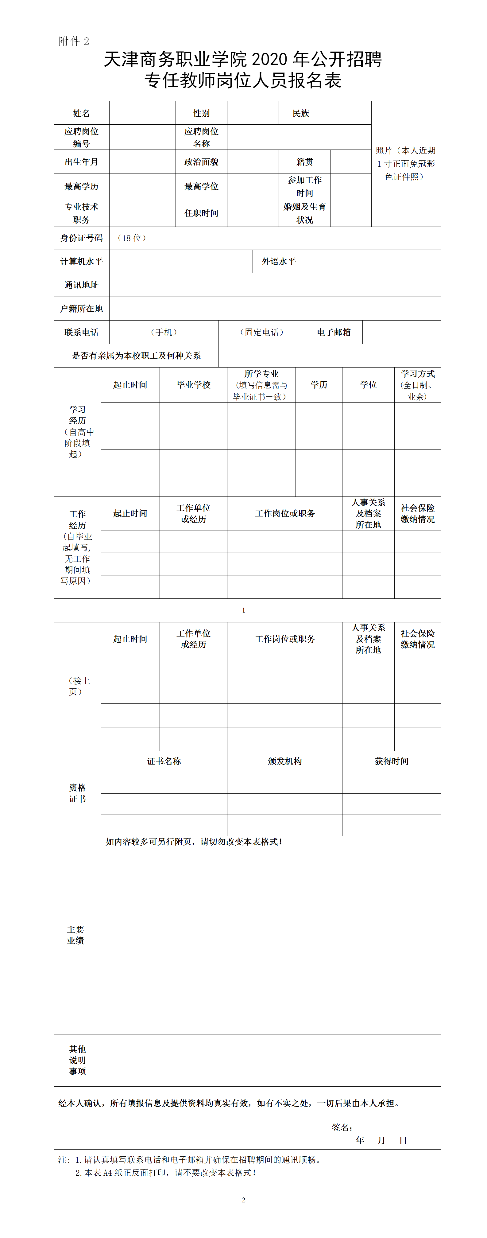 2.天津商务职业学院2020年公开招聘专任教师岗位人员报名表