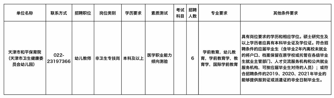 应聘人员需符合以下条件,其他具体条件详见《天津市卫生健康委员会所属天津市和平保育院(天津市卫生健康委员会幼儿园)2021 年度公开招聘计划表》: