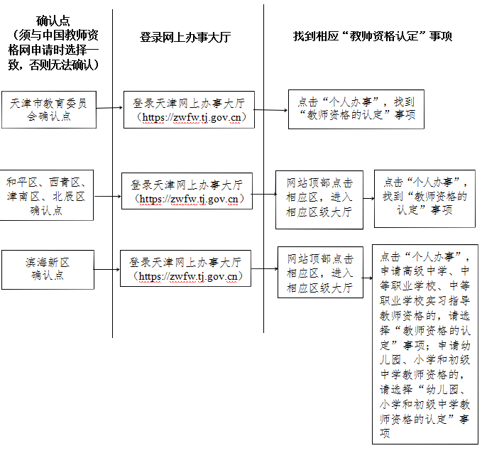 系统注册完成后,申请人可于 8 月 6 日上午 9:00 至 8 月 12 日下午 5:00 期间,登录天津网上办事大厅(https://zwfw.tj.gov.cn)进行网上确认。网上申请时选择天津市教育委员会确认点的申请人,登录后点击“个人办事”,即可找到“教师资格的认定”事项。网上申请时选择滨海新区、和平区、西青区、津南区、北辰区确认点的申请人,请在网站顶部点击相应区,即可进入相应区级大厅,再点击“个人办事”,即可找到事项。其中选择滨海新区确认点的申请人,申请高级中学、中等职业学校、中等职业学校实习指导教师资格的,请选择“教师资格的认定”事项;申请幼儿园、小学和初级中学教师资格的,请选择“幼儿园、小学和初级中学教师资格的认定”事项。请申请人务必按照网上申请时选择的确认点进行网上确认, 未在 7 月 20 日—7 月 31 日提交网上申请的,无法进行网上确认。
