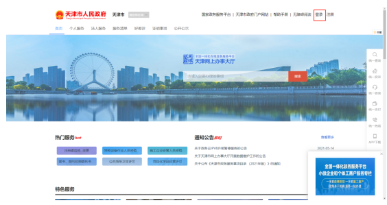 一、登录天津网上办事大厅(https://zwfw.tj.gov.cn/),点击右上角“登录”按钮