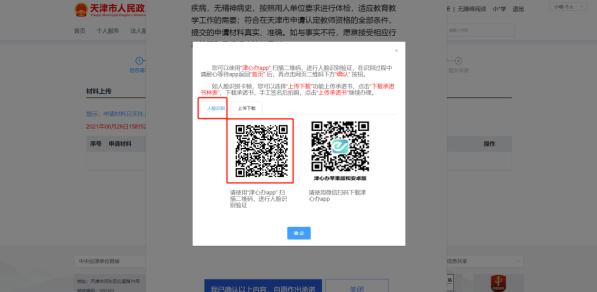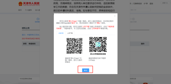 二十一、认证成功后,“津心办app”会返回首页;如果没有自动返回首页或者未出现任何提示,代表认证没有成功;此时请点击申报页二维码下方“确认”按钮,以重新生成二维码,而后再使用津心办app扫描左侧二维码,重复上述身份认证流程。