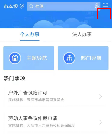 二十、点击下方导航栏“办事大厅”,点击右上角“扫一扫”按钮,扫描网厅左侧二维码,按照app提示完成人脸扫描