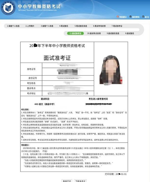 登录进来后,点击“11.面试准考证”,然后根据提示下载pdf准考证文件。下载后,仔细核对个人信息,并直接打印成准考证。