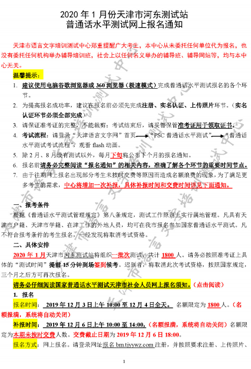 2020年1月份天津市河东测试站普通话水平测试网上报名通知