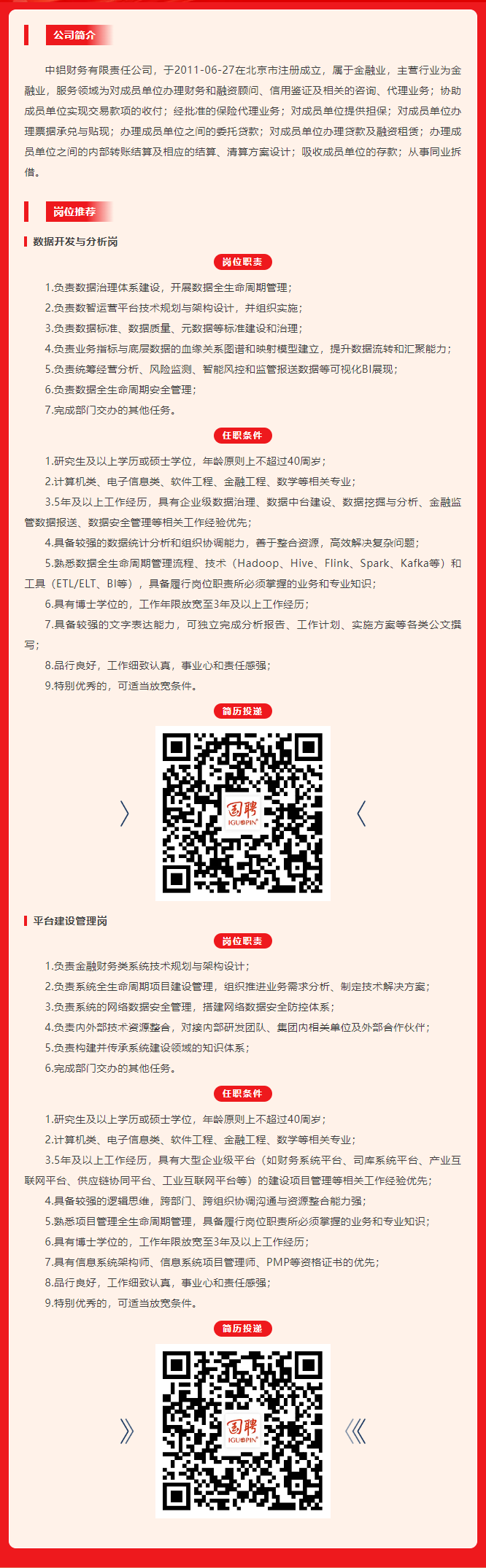 中铝财务有限责任公司社招岗位推荐