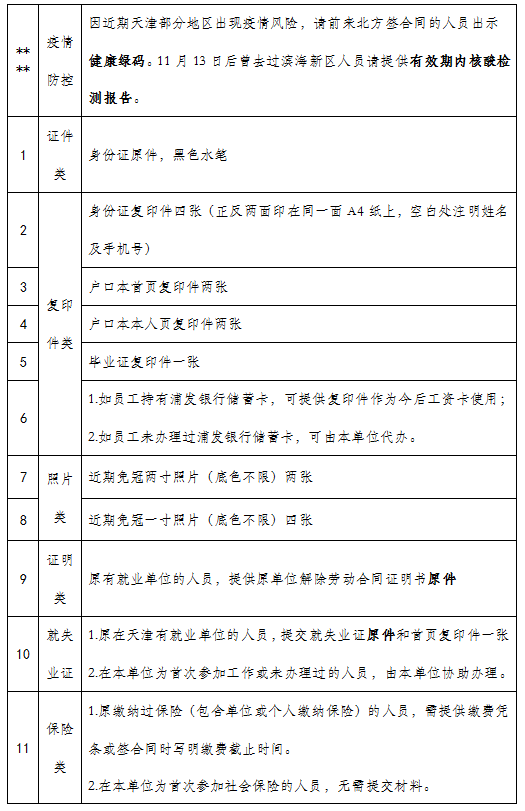 3、已于11月23日电话沟通因滨海疫情影响不到场签合同人员,请按入职所需材料明细准备入职材料。入职材料将于11月27日由顺丰寄出到电话中确认地址,请按模板填写完成后,在12月8日前将个人材料与签约材料寄回快递中提供的地址。