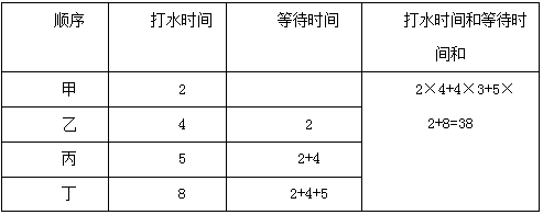 由题中分析:保证取水时间最小的人最先取水,就能确保等待时间最短。所求打水时间和等待时间和最小为:2×4+4×3+5×2+8=38分钟。
