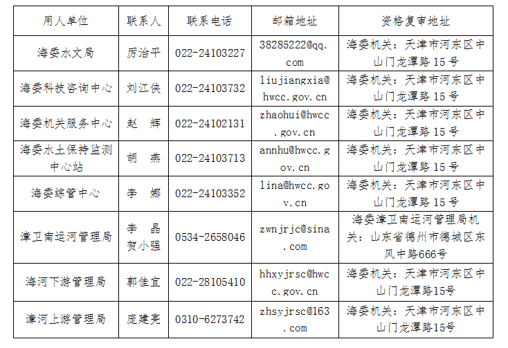 2.报名方法:考生填写《水利部海委所属事业单位公开招聘工作人员报名登记表》(附件2),通过电子邮件发送到用人单位,每位考生限报一个岗位。各用人单位对考生进行资格审查,并通过电子邮件回复资格审查意见。