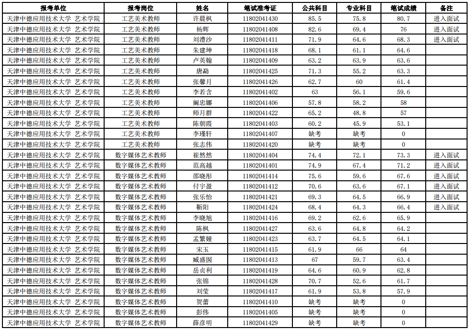 天津中德应用技术大学2020年公开招聘硕士教师岗位工作人员笔试成绩