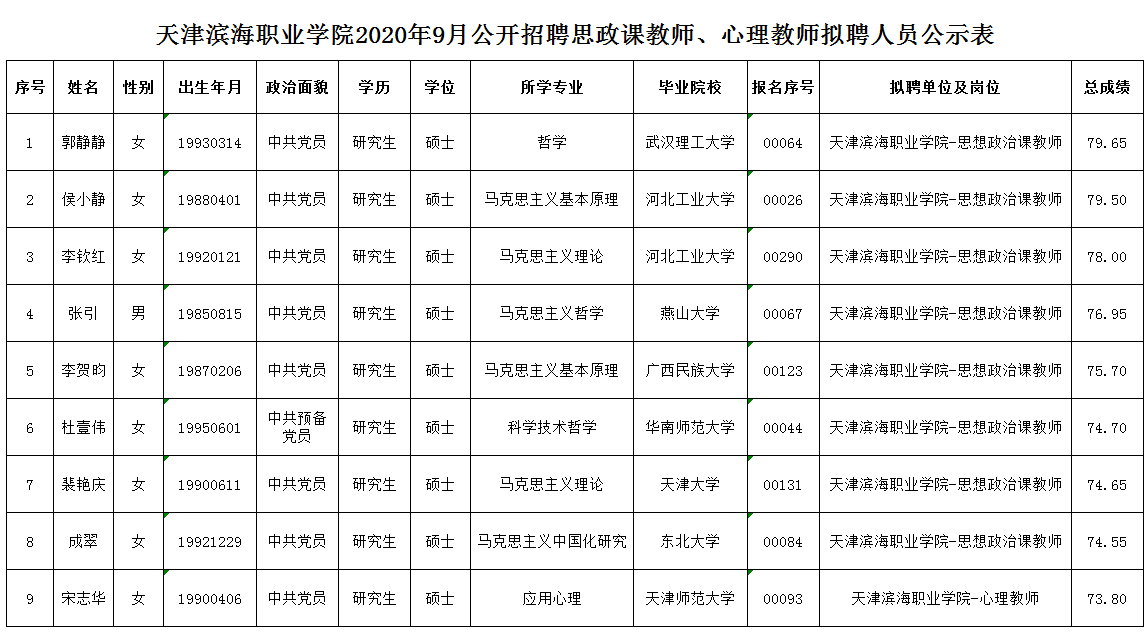 天津滨海职业学院2020年9月公开招聘思政课教师、心理教师第一批拟聘人员公示