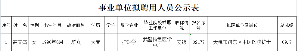 按照《天津市事业单位公开招聘人员实施办法(试行)》(津人社局发〔2011〕10号)要求,现将拟聘用人员予以公示。
