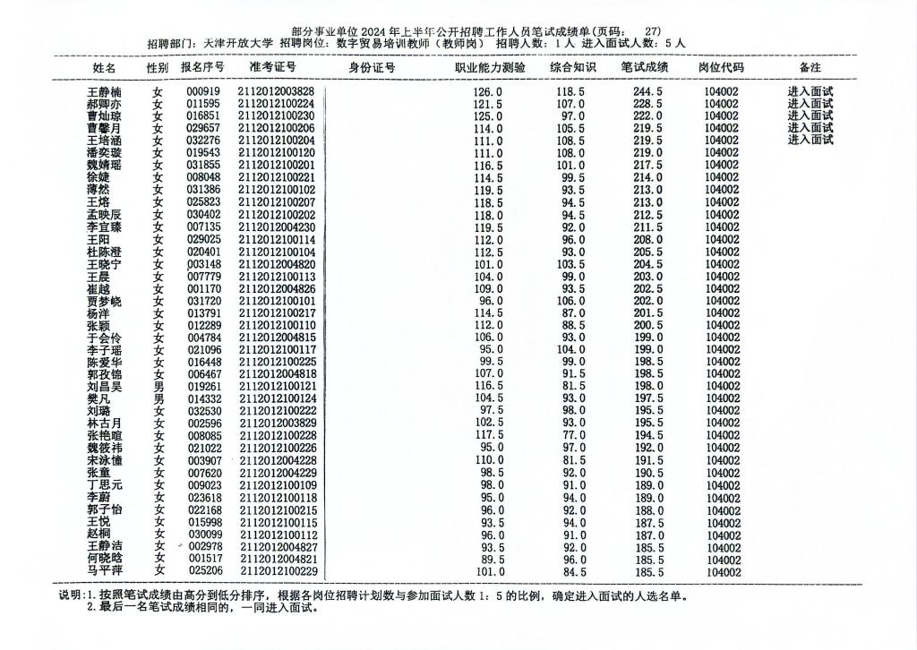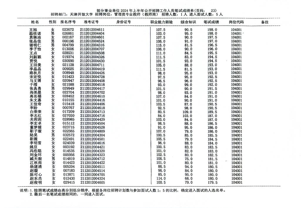 关于公布天津开放大学2024年第二批公开招聘笔试成绩的通知