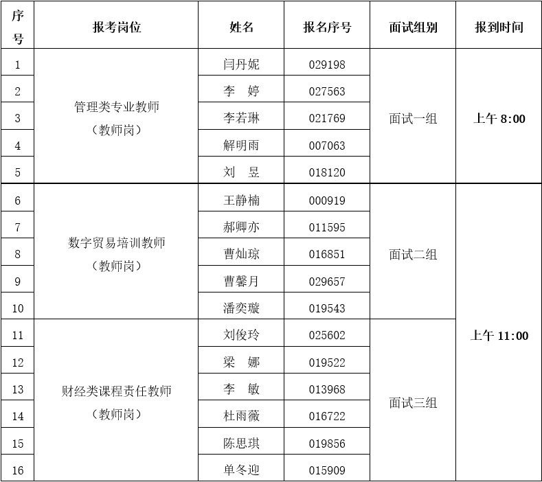 (三)请报考管理类专业教师的考生于上午8:00,报考数字贸易培训教师、财经类课程责任教师的考生于上午11:00持二代居民身份证到1号楼三层301教室(候考室)报到,未携带证件不得参加面试。考生经抽签后,按抽签顺序依次参加面试。