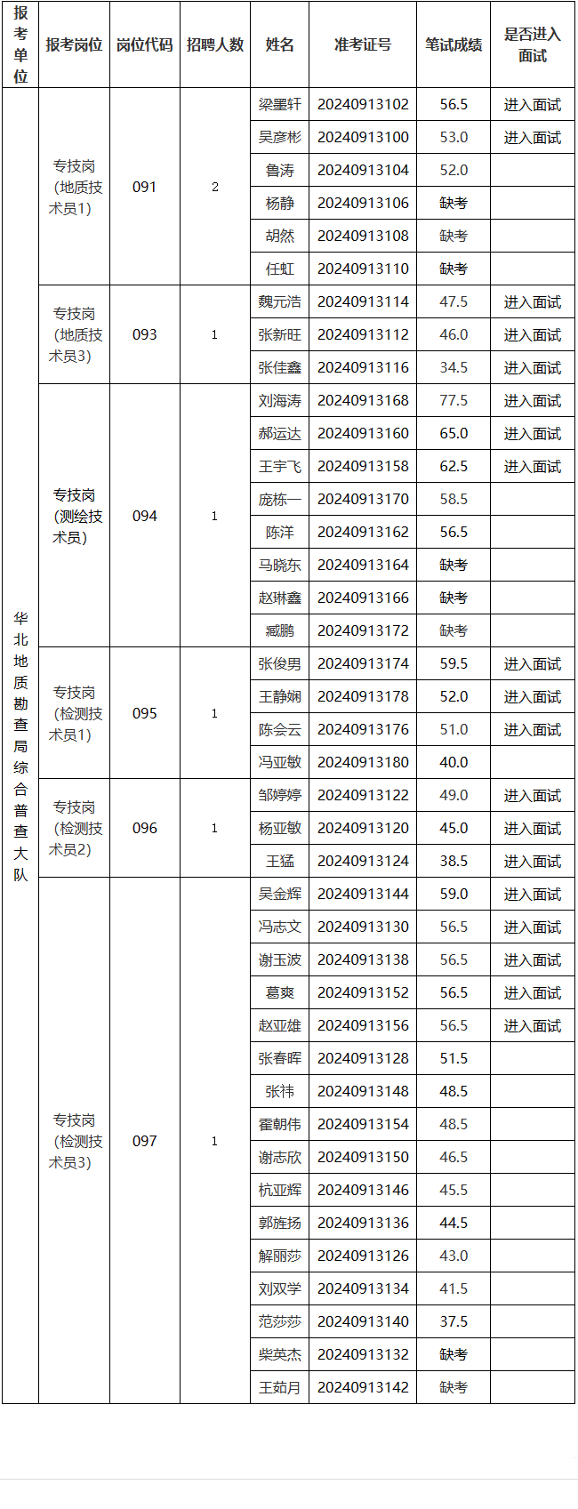 华北地质勘查局综合普查大队2024年第三批公开招聘工作人员笔试成绩