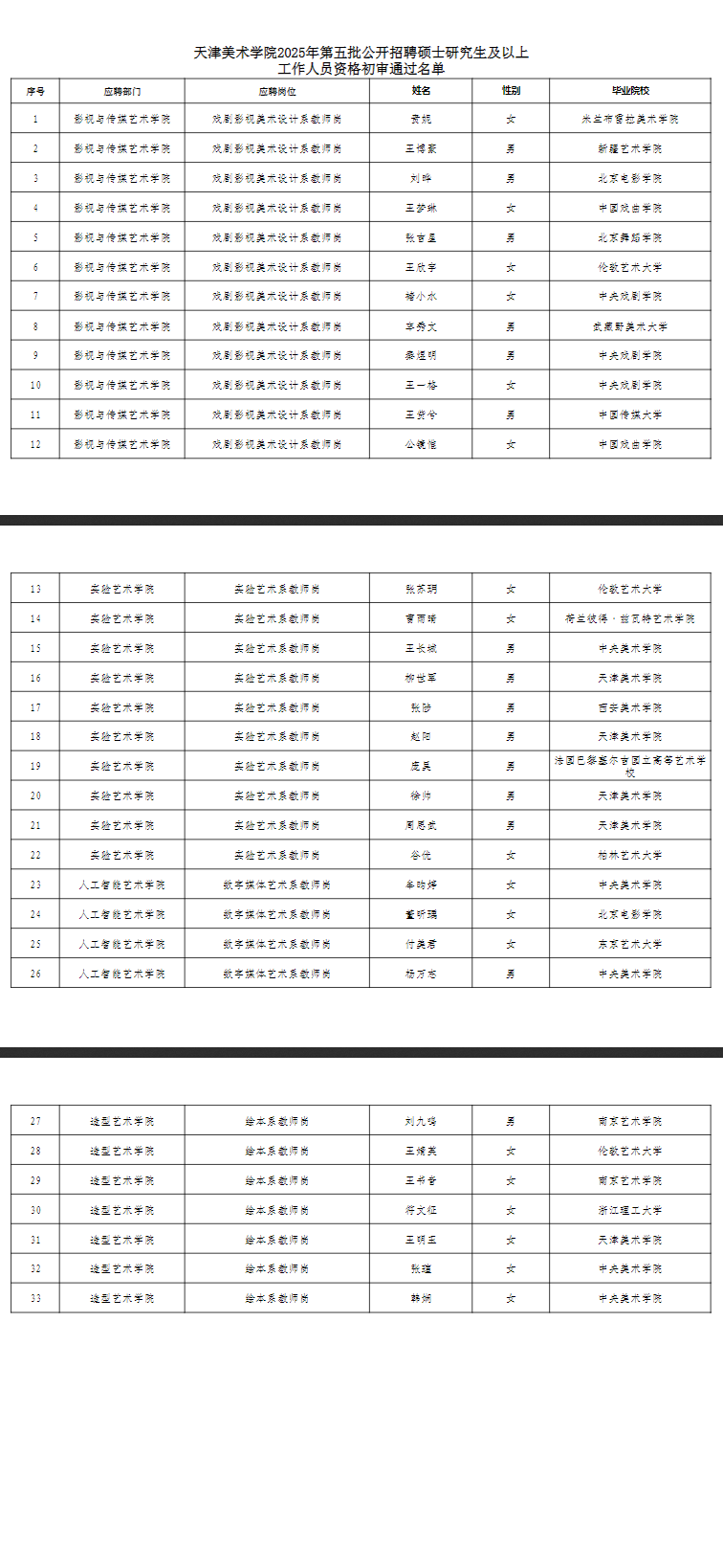 天津美术学院2025年第五批公开招聘硕士研究生及以上工作人员资格初审通过名单