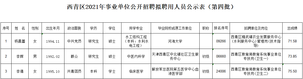 西青区2021年事业单位公开招聘工作人员,经报名、笔试、面试、体检、考察等环节,第一批、第二批、第三批已公示,第四批共计3人符合条件,按照《西青区2021年事业单位公开招聘工作人员公告》,现将第四批拟聘用人员予以公示。