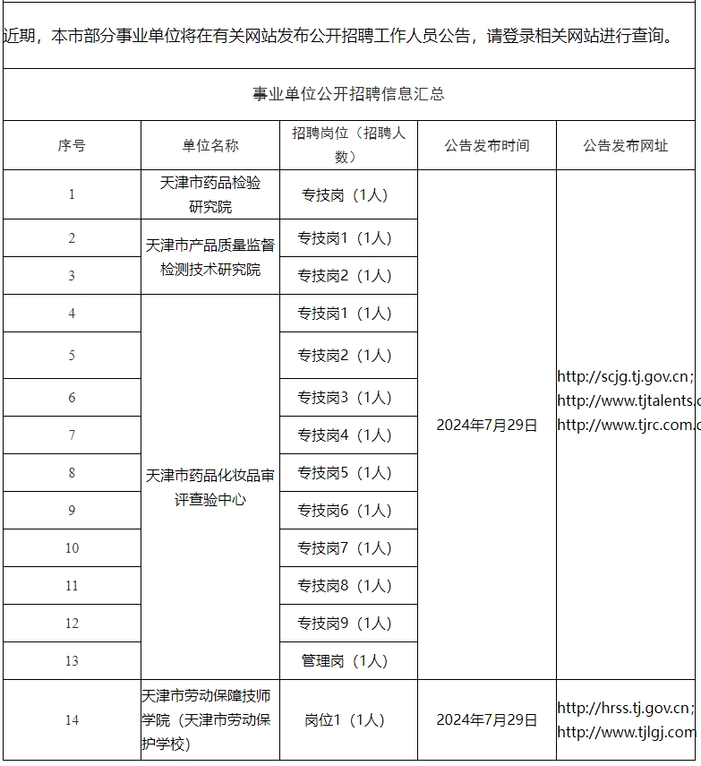 天津市市场监督管理委员会所属事业单位2024年下半年公开招聘工作人员13人公告