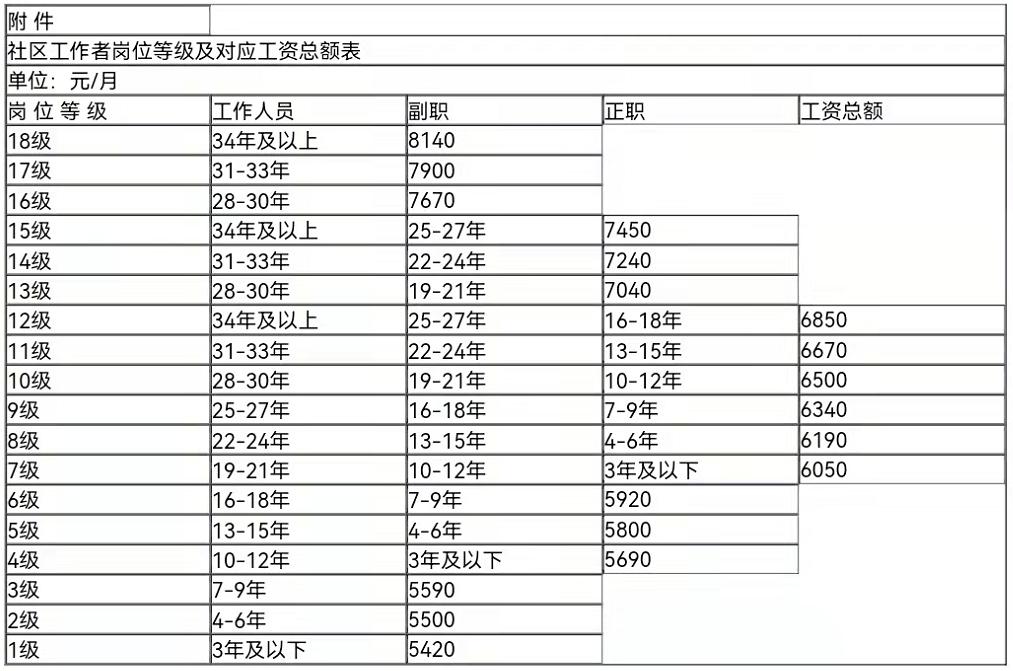 1.社区工作者岗位等级及对应工资总额表