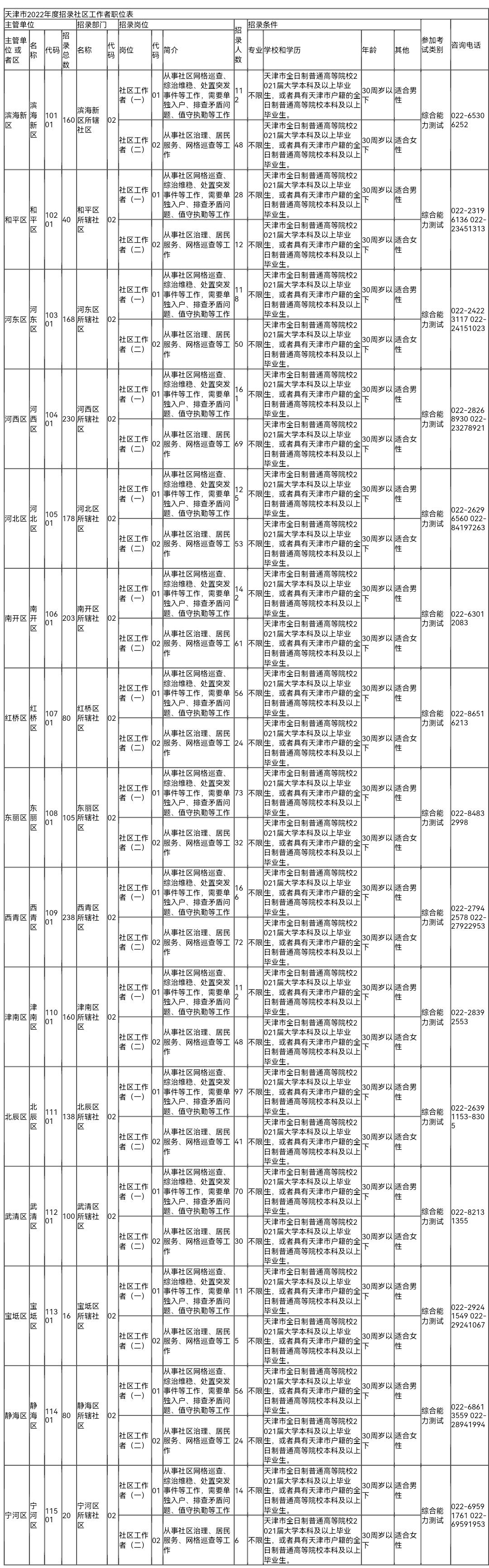 2.天津市2022年度招录社区工作者职位表