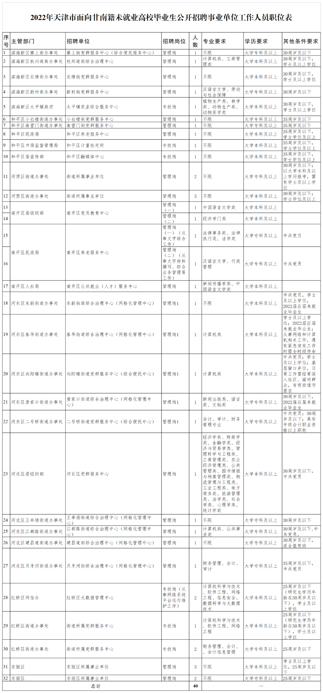 本次招聘工作按照“统一报名、统一考试、统一聘用”的原则,计划招聘40名甘南籍未就业高校毕业生到天津市有关区所属事业单位工作。