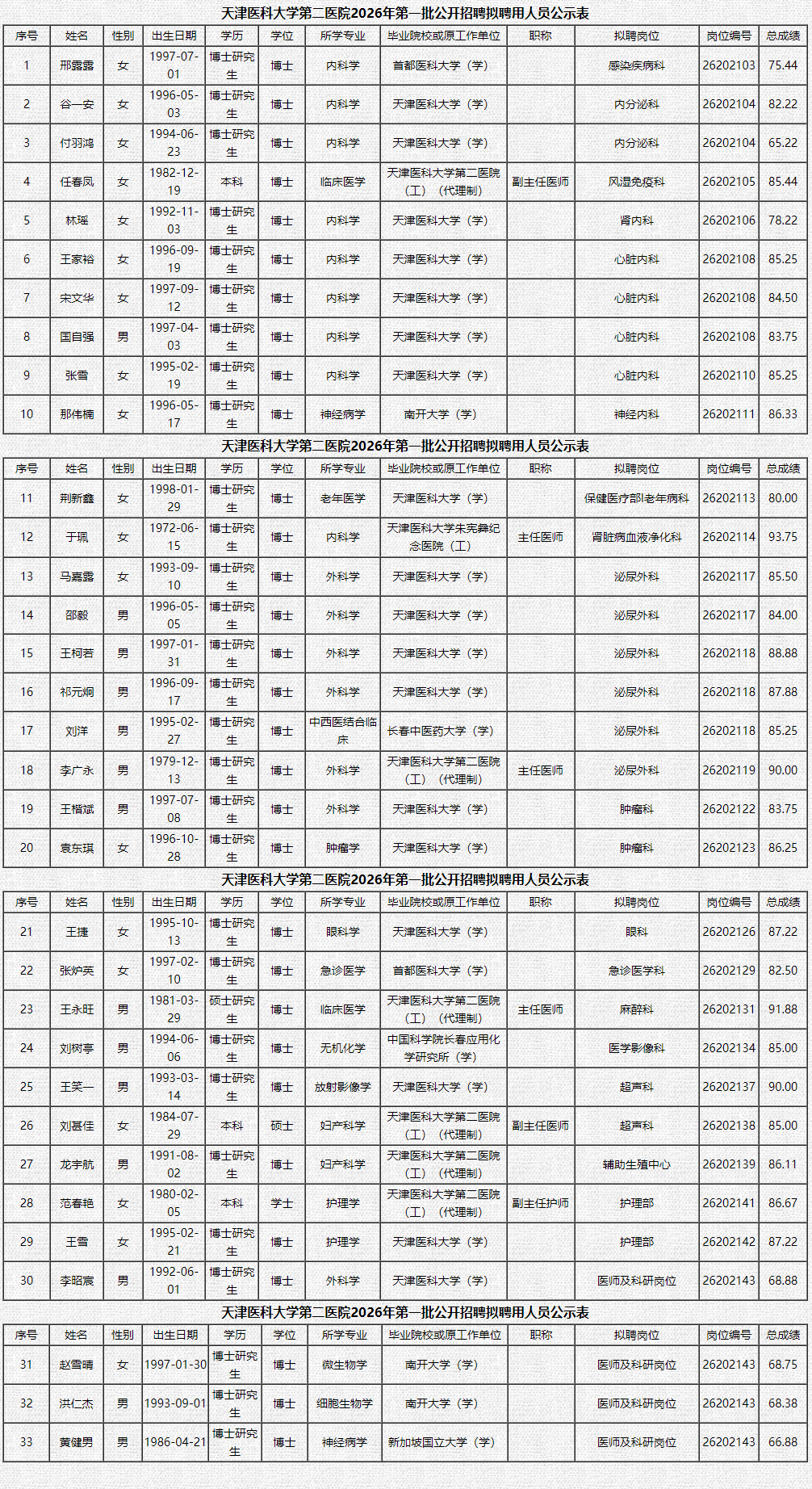 天津医科大学第二医院2026年第一批公开招聘拟聘用人员公示