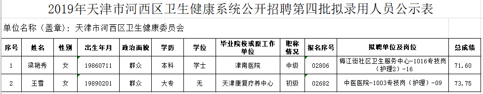 附:2019年天津市河西区卫生健康系统公开招聘第四批拟录用人员公示表