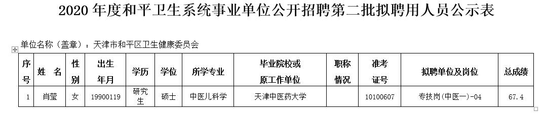 2020年度和平区卫生健康系统事业单位公开招聘第二批拟聘用人员公示