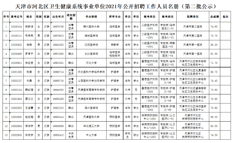 天津市河北区卫生健康系统事业单位2021年公开招聘工作人员拟聘用人员公示(第二批)