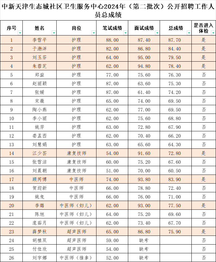 中新天津生态城社区卫生服务中心2024年(第二批次)公开招聘工作人员总成绩公示及体检通知
