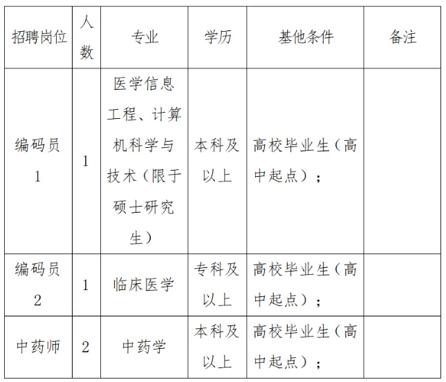 3.笔试及技能操作:按专业组织,笔试实行百分制,满分100分,最低合格分数线为60分。笔试时间为2小时。岗位报考人数与招聘人数的比例不低于3:1,报名人数达不到开考比例的,减少该岗位招聘人数或取消该岗位招聘计划。笔试结束后当日在院公示栏公示笔试成绩,笔试成绩公布后,编码员2岗位、中药学岗位在合格线以上从高分到低分按计划招聘人数与进入技能操作考试人选1:3的比例确定进入技能操作考试人选,合格线以上计划招聘人数与进入技能操作考试人选不足1:3比例的,都进入技能考试。技能考试实行百分制,满分100分,最低合格分数线为60分,成绩当日在院公示栏张贴公示。