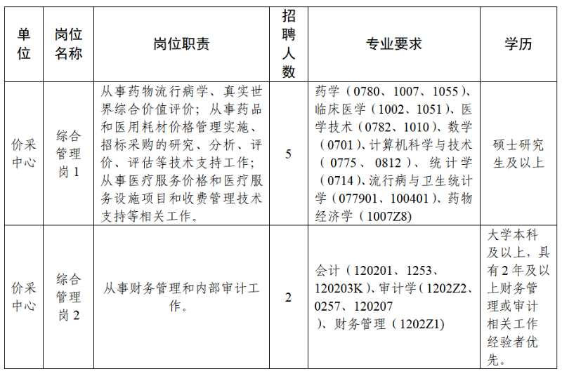 国家医疗保障局医药价格和招标采购指导中心(以下简称价采中心)是国家医疗保障局直属事业单位,主要承担制订医药价格技术标准规范、监测医药价格信息、协助指导省级医药招标采购平台建设和运行等工作。根据工作需要,现面向社会公开招聘合同制人员,有关事项公告如下: