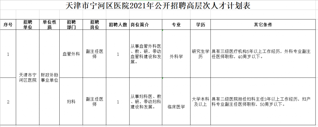 公开招聘高层次卫生人才2名。具体招聘岗位、条件等信息详见《天津市宁河区卫健系统事业单位公开招聘高层次卫生人才计划表》。