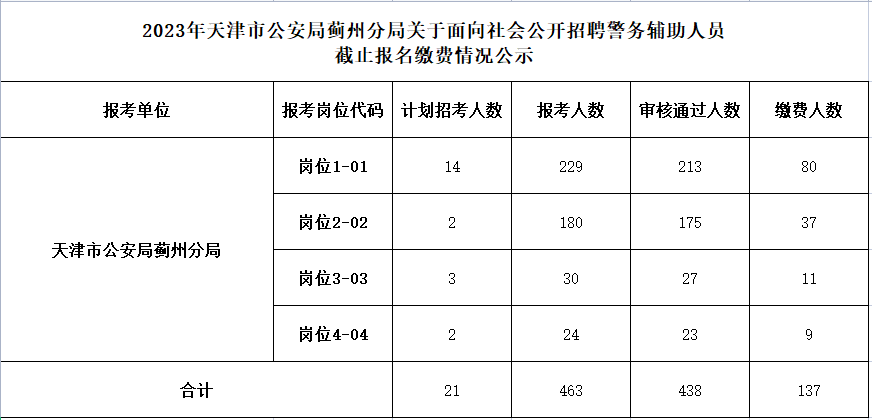 2023年天津市公安局蓟州分局关于面向社会公开招聘警务辅助人员截止报名缴费情况公示