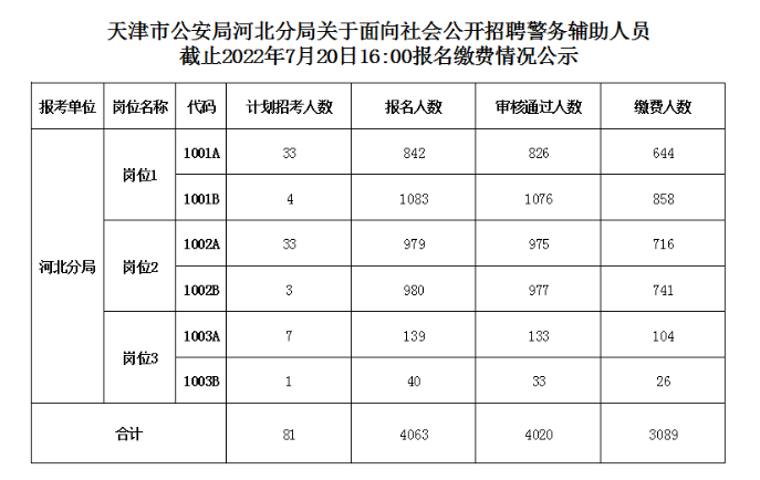 天津市公安局河北分局关于面向社会公开招聘警务辅助人员截止2022年7月20日16:00报名缴费情况公示